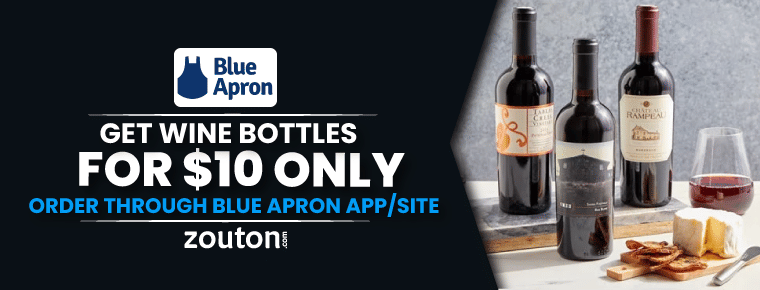 Users can get wine bottles at $10 using Blue Apron coupons. This is available in bottle size: 6x500ml. Users can choose from wine types like red, white and mix. All users can order through the Blue Apron app/site. A Blue Apron coupon code is not required at checkout. This Blue Apron deal is valid on online transactions via the app or website.