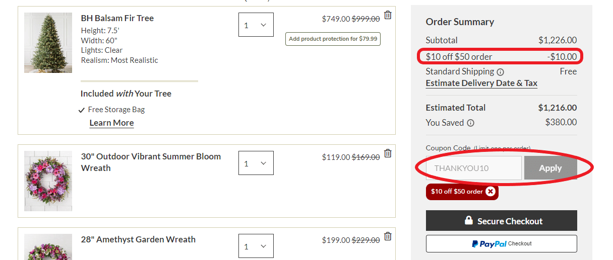 Use their coupon code "THANKYOU10" to get as much an extra $10 off on trees, wreaths, lanterns, decor, storage & accessories, etc.