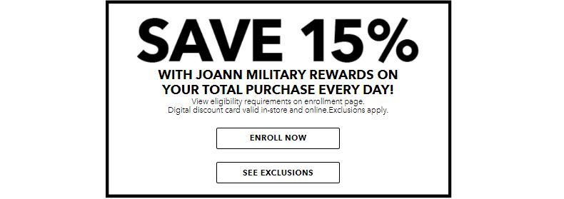 Joann offers a special military discount of flat 15% off on your total purchase.