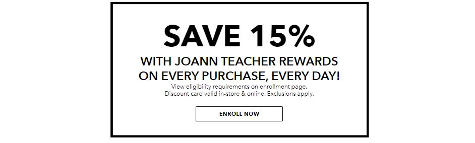 Teachers are dedicated to their students. They sacrifice time, patience and even their own money to help ensure a quality & fun education for all kids. Because of this hard work, JOANN wants to help you with 15% off every purchase, every day.
